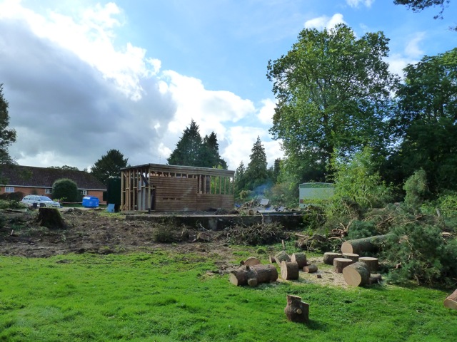 The site for the Pavilion buildings is really opening up now. This mud hut was built in the late 90s (I think) and wasn’t expected to last so very long. And now it is pretty much gone. A pine tree has also been felled but I understand that the surrounding trees will remain. With the large hedges around the garages gone too, for the first time today I could imagine the new buildings in place.