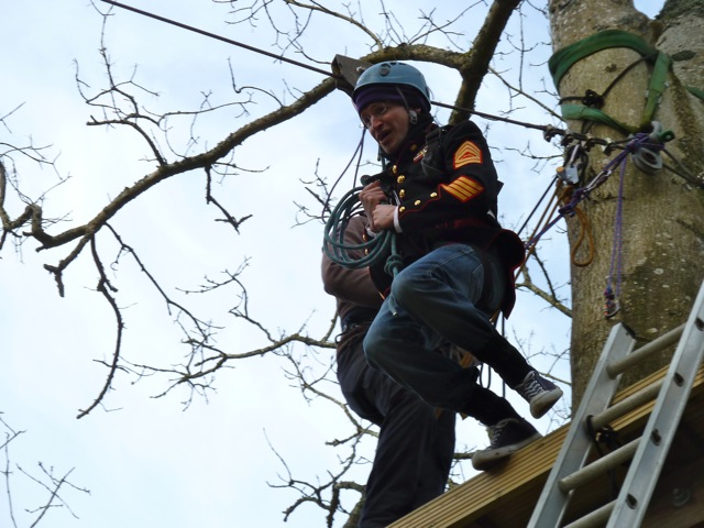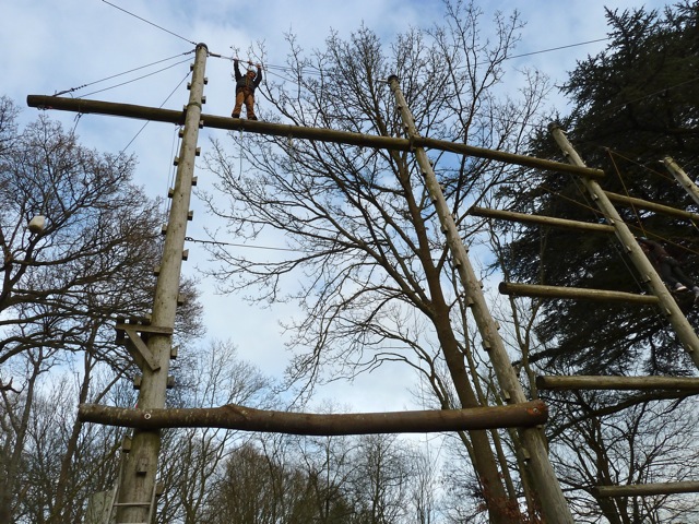After a break for lunch, time for the climbing. First a climbing wall wrapped round a tower, then a high and fast zip wire. The assistant seemed to take some time to learn to stop us correctly, with Martin reaching the end at high speed and his hemetted head hitting the wire, then Tristan and Gavin being stopped suddenly by their harnesses. I was glad he had sussed it by my turn. Then the high ropes section, the highest we climbed, balancing across beams and wires way way up.