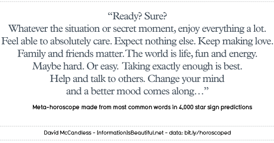 I’m not saying there is nothing in astrology but I don’t think there’s much wisdom in the ready horoscopes you get in papers and online. Perhaps as proof, here’s a graphic of analysis of 4000 ‘scopes. The grey words are common to all, the red words unique to a star sign: