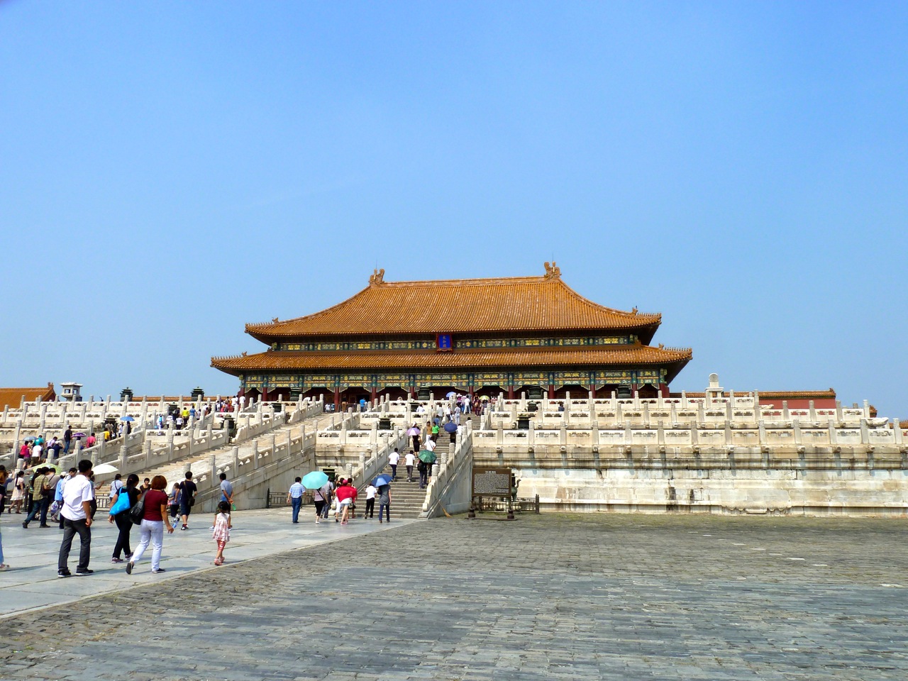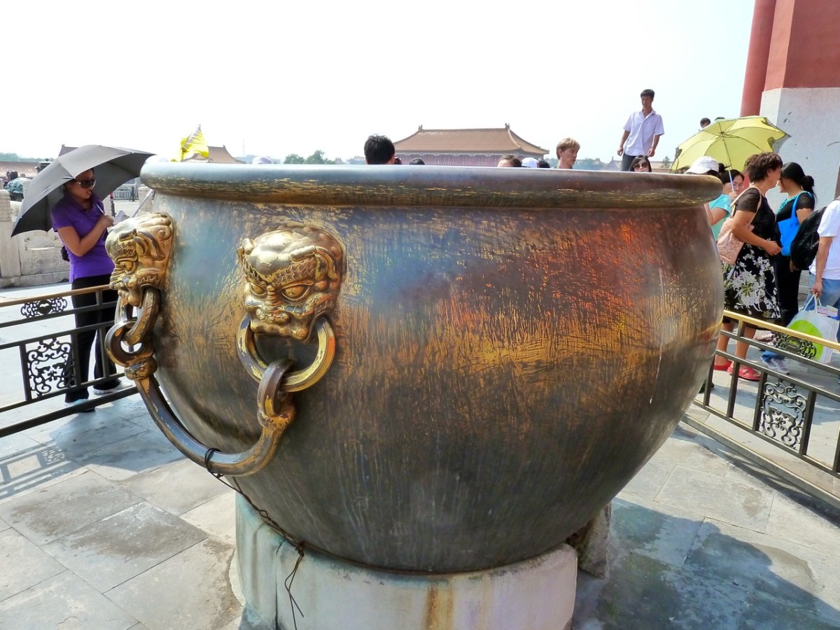 Inside are a series of very large courtyards, divided by more archways, with gold coloured roofs. Everything is on a grand scale – from the walls, the cobbles, to the cauldrons for putting out fires, kept frost free in winter by fires. A river runs through the city, with decorative white stone bridges.